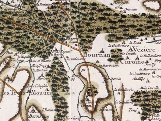 « Comme encore tenons de vous nos jardins enfermés de murailles joignant les douves de notre dit chastel avec notre part de garenne appelée le Bois de Craon, planté en bois de haute futaie et taillis dessous et une pièce de terre labourable dans laquelle sont plantés plusieurs arbres fruitiers, appelée les grands jardins, le tout en un tenant et enfermé de fossés contenant soixante dix arpents, joignant d’un long à notre poublaye ci après confrontée, d’autre au chemin tendant de Vézières à Bournand, d’un bout au bois de Chanteloup et d’autre au cimetière de Bournand qui autre fois dépendait de nous et était dans nos domaines et fut baillé par nos prédécesseurs à la paroisse de Bournand pour servir de sépulture.